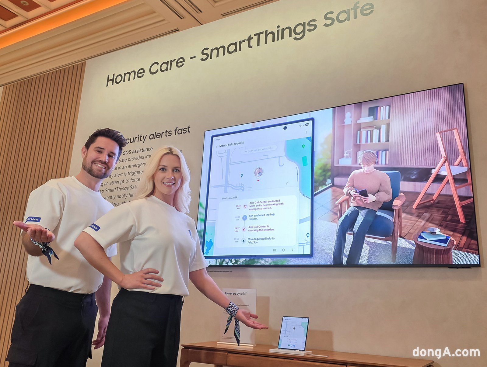 삼성전자 코디네이터가 사용자가 위기 감지 시 스마트폰이나 태블릿에서 버튼 하나만 누르면 가족에게 현재 위치 공유 및 알람을 보내주는 ‘스마트싱스 세이프’ 기능을 소개하고 있다.삼성 ‘스크린 에브리웨어’ 가동