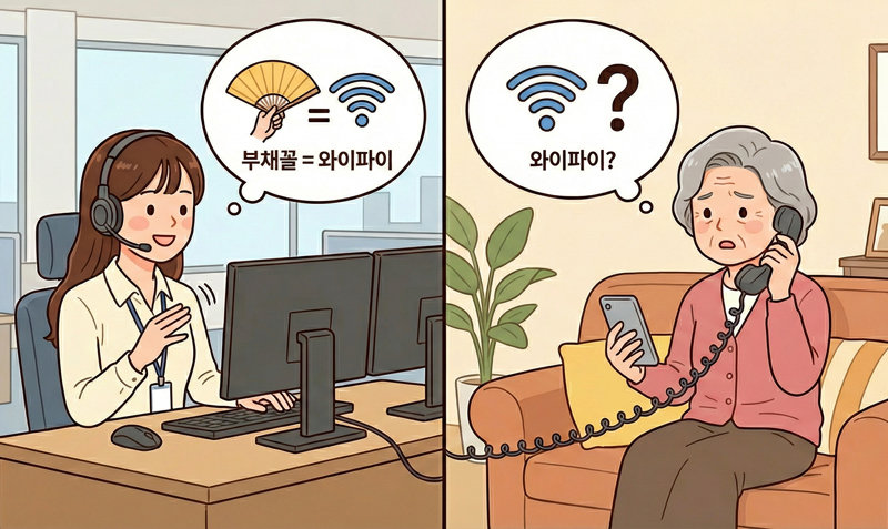 “‘유튜브가 갑자기 나오지 않는다’는 78세 고객의 문의 전화였습니다. 비슷한 연령대 고객 사례와 비교했을 때 와이파이 연결 문제로 판단했습니다. 디지털 기기에 익숙하지 않은 고객임을 감안해 최대한 직관적이고 이해하기 쉬운 방식으로 안내했습니다. 예를 들어 와이파이는 ‘부채꼴 모양 아이콘’, 단말기 측면 버튼은 ‘옆구리나 관자놀이’, 공유기는 ‘뿔 두 개 달린 기계’로 설명했습니다.