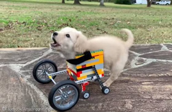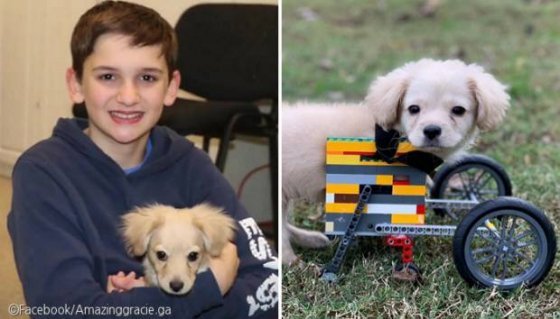 [노트펫] 선천적으로 앞다리 없이 태어나 버림을 받은 강아지가 한 소년에게 레고 휠체어를 선물 받고 새 삶을 살게 됐다.