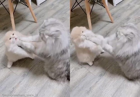 [노트펫] 키 차이 때문에 싸움도 시작하기 전 멱살부터 잡힌 새끼고양이의 모습이 공개돼 웃음을 자아내고 있다.