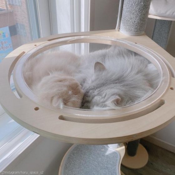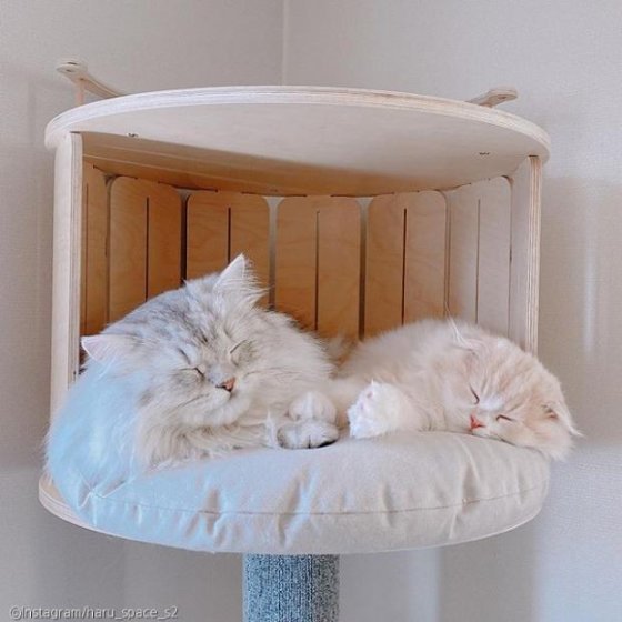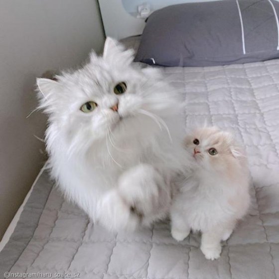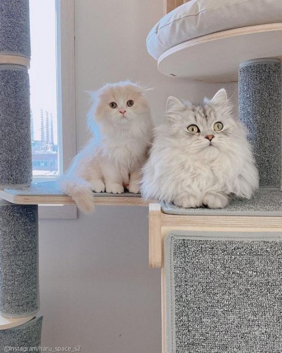생후 1년 7개월 된 페르시안 친칠라 하루와 생후 4개월 된 하이랜드 폴드 우주는 둘 다 애교가 많은 개냥이들이다.