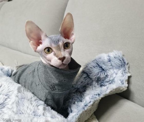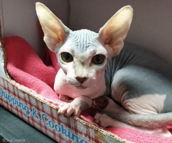4개월 차 스핑크스 고양이 '복순이'는 집사 사듀 씨의 가족이 된 지 얼마 되지 않았다.