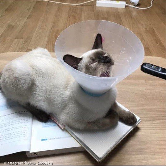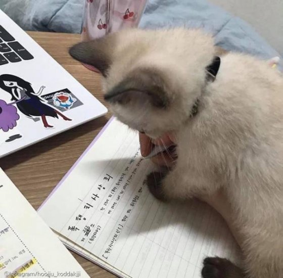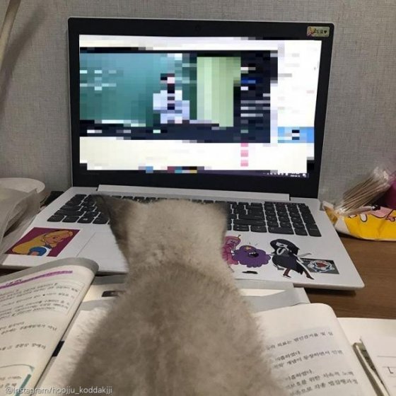 "그러다 책상에 올라오더니 저렇게 방해를 하기 시작했다"며 "이때 너무 귀여워서 '진짜 내가 공부하는 게 중요한 게 아니라 이 모습을 빨리 사진으로 남겨야겠다'는 생각이 강하게 들어, 입 틀어 막고 사진을 찍게 됐다"고 당시 상황을 설명했다.