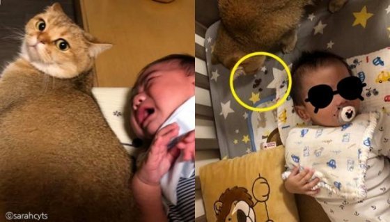 [노트펫] 울음을 그치지 않는 아기 집사가 걱정돼 안절부절못하던 고양이는 자기가 가장 좋아하는 것을 선뜻 내줬다.