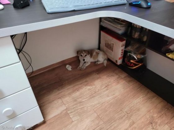 공개된 영상 속에는 테이블 밑에서 고개를 돌리고 있는 땡글이의 모습이 담겼다.