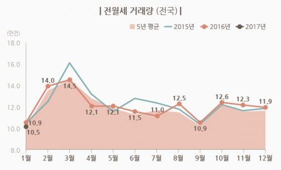 전세가 5만8254건 거래돼 작년 1월보다 3.8% 증가했고, 월세 거래는 5만780건으로 3.5% 늘었다. 아파트 월세비중은 39.9%로 전년동기 대비 0.9%포인트 감소했으나 아파트 외 주택은 0.7%포인트 증가했다.