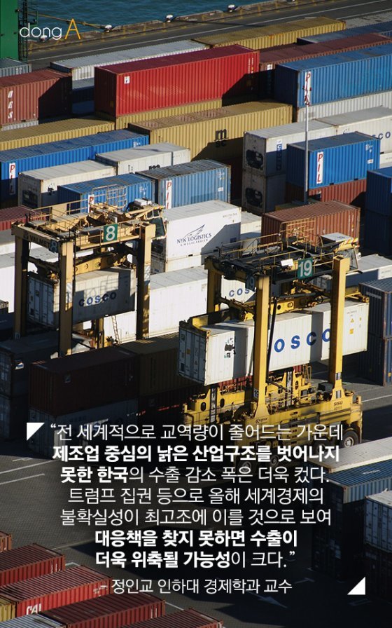 제조업 중심의 낡은 산업구조를 벗어나지 못한 한국의 수출 감소 폭은 더욱 컸다.