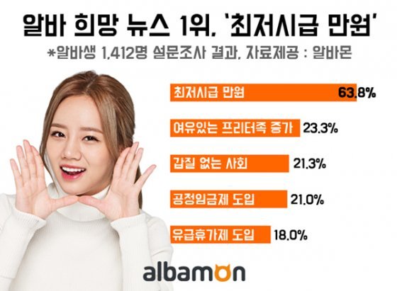 그래픽=알바몬 제공알바생이 올해 가장 듣고 싶어하는 알바 뉴스 1위에 ‘최저시급 만원’이 선정됐다.