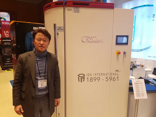 심영복 엠젠플러스 대표.현장에서 만난 심영복(55) 엠젠플러스 대표는 스포츠 스타와 구단을 타깃으로 꼽았다. “NBA 스타 르브론 제임스, 복싱 챔피언 플로이드 메이웨더 등 스포츠 스타들이 부상 치료와 컨디션 회복을 위해 크라이오테라피를 활용하고 있다”며 “영국 프리미어리그 아스날의 경우, 선수들의 부상 방지와 회복을 위해 팀 차원에서 크라이오테라피 장비를 도입했다”고 설명했다. 여기에 “린제이 로한, 데미 무어 등 할리우드 스타 역시 노화 방지와 다이어트 차원에서 애용하고 있다”며 전 세계적으로 불고 있는 크라이오테라피 열풍을 소개했다.