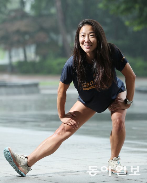 장희주 씨가 서울 광진구 어린이 대공원에서 몸을 풀고 있다. 그는 아차산과 관악산 등 수도권 산을 달리며 스트레스도 날리고 건강도 챙기고 있다. 신원건 기자 laputa@donga.com“산 내리막을 달릴 때 가장 희열을 느낍니다. 내리막을 달릴 땐 5, 6걸음 앞까지 예상해야 해서 고도의 집중력이 필요해요. 온전히 제게만 집중할 수 있어요. 모든 짐을 내려놓을 수 있는 순간이라 마음에 평화가 찾아와요. 일상 삶에도 긍정적인 영향을 줍니다.”