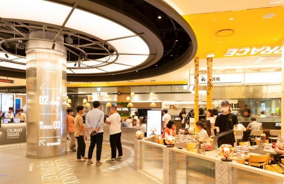 공간은 ▲블루라운지존 ▲스트리트존 ▲테라스존 등 총 3개로 구성했다. ‘블루라운지존’은 전용 키오스크를 통해 주문하고 넓은 좌석에서 식사할 수 있는 공간이다. 한식과 중식을 경험할 수 있다. 이중 ‘하이밥’은 갓 지은 솥밥과 맛있는 찌개에 집중한 한식 반상 전문 코너다. 40년 경력 명장이 중국 4대 요리를 선보이는 \'싱카이\' 캐주얼 브랜드 ‘리틀싱카이’도 입점했다. ‘명동칼국수’는 45년 전통의 손맛과 옛 맛이 살아있는 한국 대표 칼국수 전문 코너다.