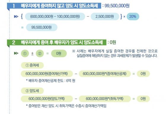 김국세 씨가 배우자에게 증여하는 대신 직접 주식을 매도할 경우 5억 원의 평가이익에서 250만 원의 공제액을 뺀 다음 20%의 양도세를 계산해 9950만 원을 내야 한다는 것과 비교하면 1억 원에 가까운 절세 사례인데요.