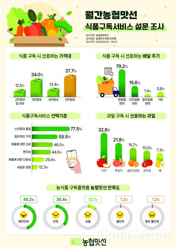 월간농협맛선 만족도 조사에서는 매우 만족 49.2%, 만족 36.4% 등 전체 응답자 중 85.6%가 긍정적인 답을 내놨다. 과일 구독의 경우 제철과일의 다양한 구성(58.3%), 품질 만족(59.%), 편리한 배송 서비스(45.1%) 등이 장점으로 꼽혔다.