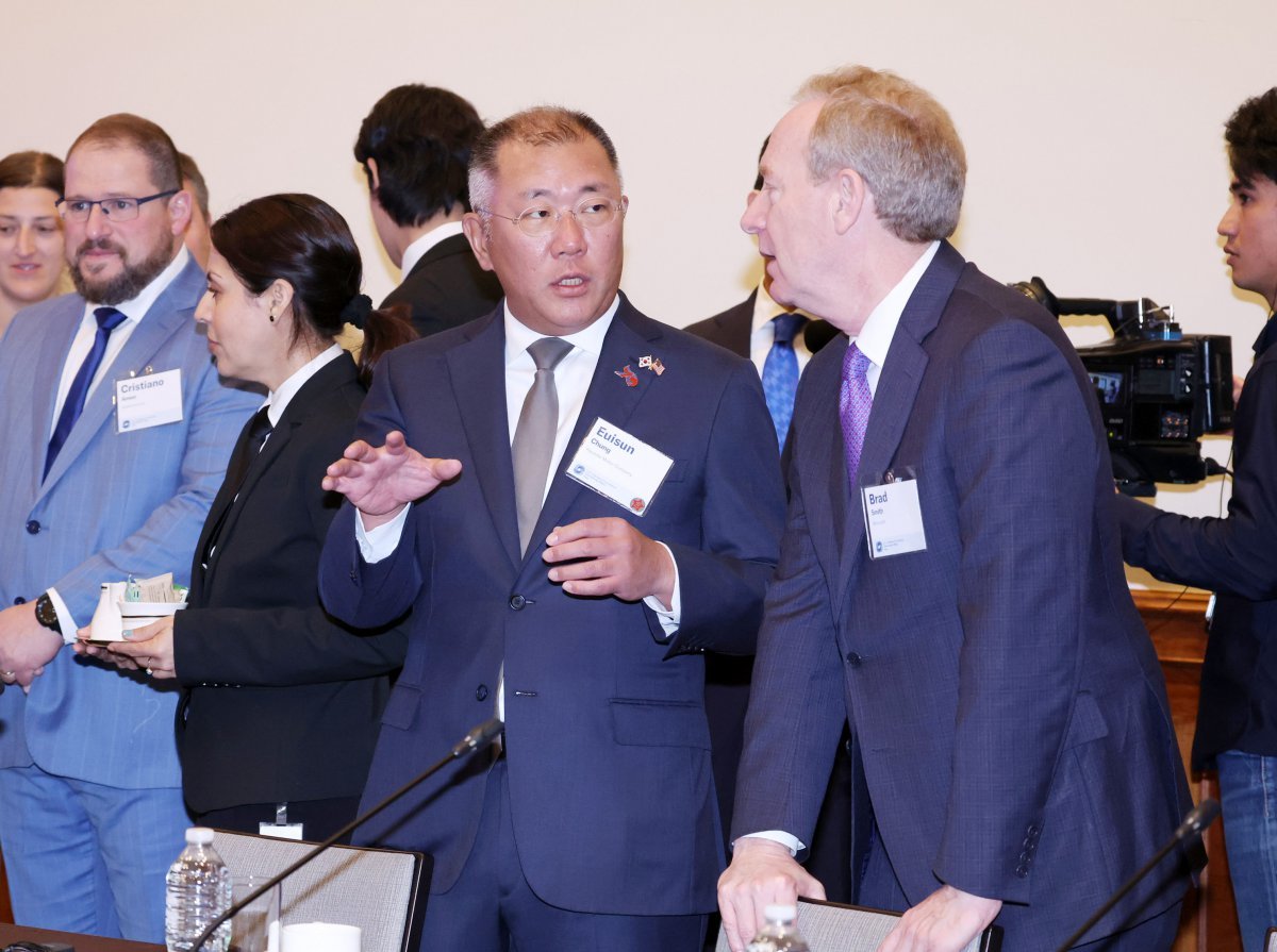 정의선 현대차그룹 회장이 25일(현지시간) 워싱턴DC 미국 상공회의소에서 열린 한미 비즈니스 라운드테이블에 앞서 참석자들과 대화하고 있다. 2023.04.26. 뉴시스