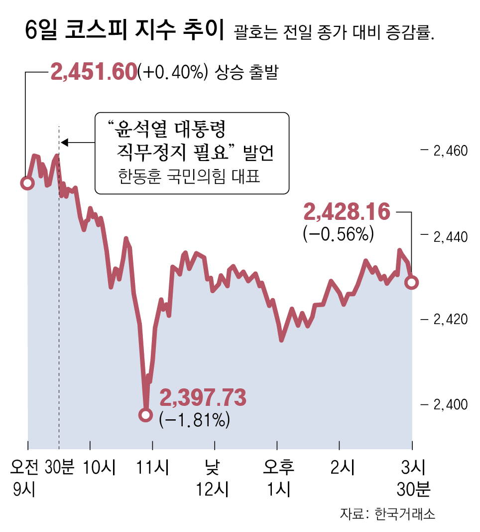6일 코스피는 전장보다 9.75포인트(0.4%) 오른 2,451.60으로 오랜만에 상승 출발했다. 하지만 오름세를 키우는 듯했던 증시는 정치 리스크에 또다시 발목이 잡혔다. 오전 9시 30분경 한 대표가 긴급 최고위원회의에서 “윤 대통령의 조속한 직무집행정지가 필요하다”고 발언한 뒤 증시가 즉각 반응한 것이다. 오전 10시 30분경 군인권센터가 긴급 기자회견을 열어 “2차 계엄 의심 정황을 포착했다”고 발표하자 하락 폭이 더 커졌다. 코스피는 오전 장중 2,397.73까지 미끄러져 내렸다.