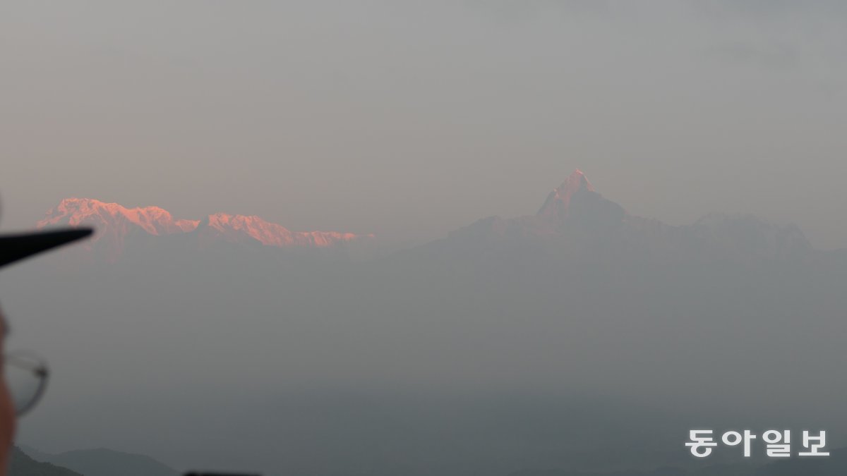 네팔 포카라 ‘사랑곳 전망대’에서 바라본 일출. 포카라=민동용 mindy@donga.com태양이 어느 정도 솟아오르자 어깨동무한 설산(雪山)들이 드디어 나타난다. 며칠 밤낮을 쉬지 않고 걸어야 하는 거리지만 손 내밀어 휘저으면 닿을 것 같다. 상상 이상으로 시야가 트인다. 삶의 지경(地境)이 팽창한다.
