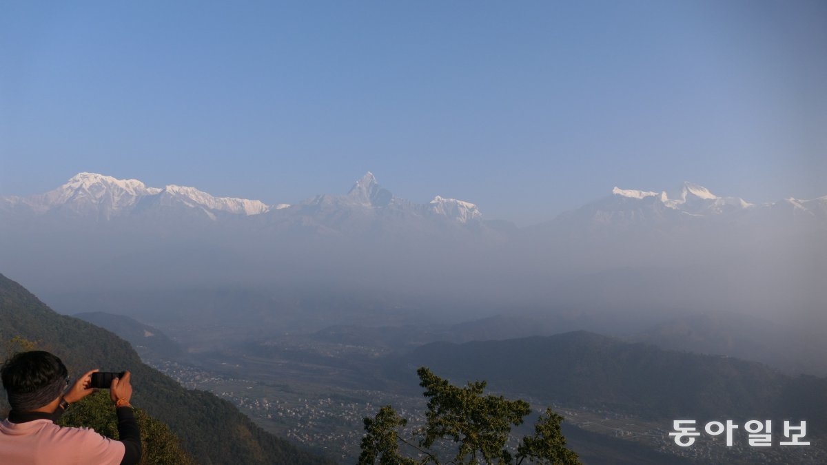 네팔 포카라 ‘사랑곳 전망대’에서 히말라야 안나푸르나 연봉을 바라본다. 가운데 뾰족 솟은 마차푸차레 왼쪽으로 안나푸르나 1봉과 남봉, 오른쪽으로 3봉, 4봉, 2봉이 각각 보인다. 포카라=민동용 mindy@donga.com‘절대 존재’ ‘진리와 불멸의 상징’ 히말라야에서의 사투(死鬪)와 전망대에서의 조망을 견줄 순 없다. 엄 대장의 ‘산이 곧 나고, 내가 곧 산이다’ 같은 경지는 언감생심(焉敢生心)이다. 그러나 아무 생각 없이 바라보는 것만으로도 벅차다.