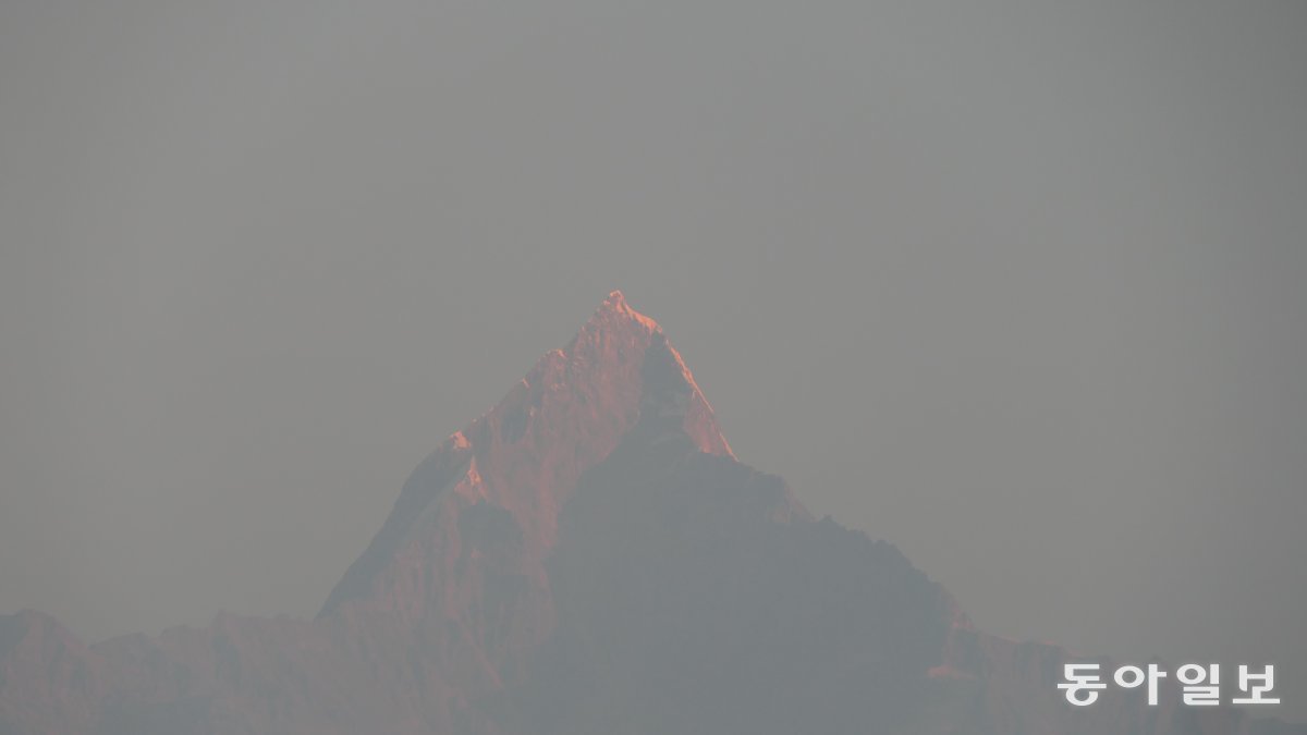 마차푸차레(6997m)가 동녘 빛을 받아 붉으스름해졌다. 포카라=민동용 mindy@donga.com전날 포카라로 오는 비행기는 예정 시간보다 5시간가량 늦게 출발했다. 안개 때문이었다. 안절부절 짜증을 내며 기다렸다. 네팔 사람들은 평온해 보였다. 안나푸르나를 바라보며 깨달았다. 빨리 오든 늦게 오든 산은 늘 기다려 준다. 신도 마찬가지일 것이다.