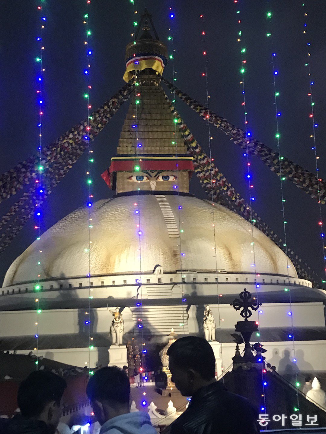 네팔 수도 카트만두에 있는 보다나트 스투파. 부처의 눈이 모든 고민과 번민과 불안을 꿰뚤어 보고 있다. 카트만두=민동용 mindy@donga.com스투파 주위를 3층짜리 상가들이 둘러싼다. 서울 종로 탑골공원도 1960년대에는 울타리 대신 2층 아케이드가 둘러싸고 있었다. 스투파를 에워싼 건물들이 낯설다. 건물들이 촘촘히 서 있다. 한 건물 외벽이 옆 건물 외벽과 붙어도 있다. 틈이 거의 없다. 신도 부대끼는 서민의 삶 속에 있는 것 같다.