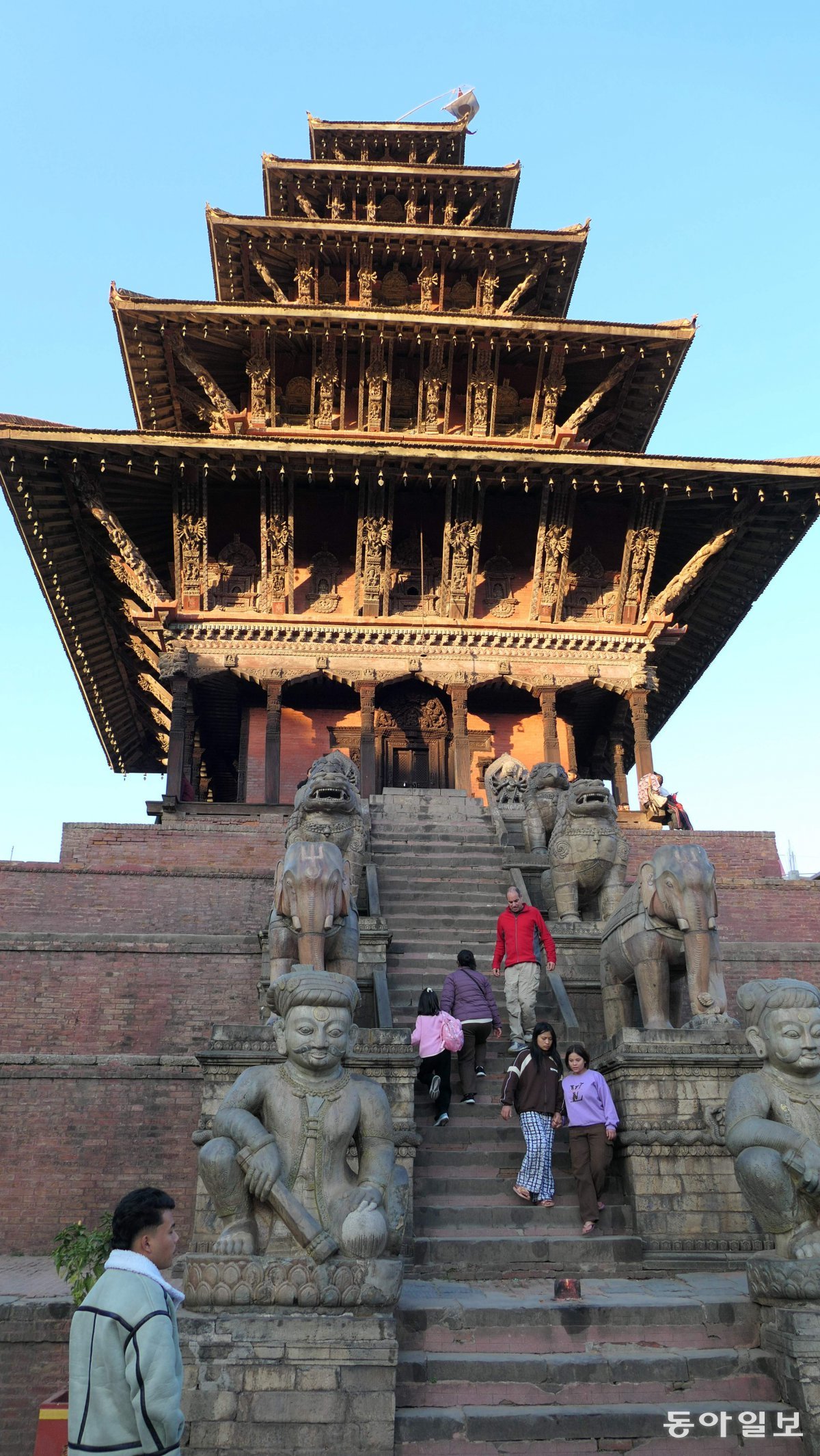 말라 왕조의 유적 도시 바크타푸르. 카트만두=민동용 mindy@donga.com18세기 초에 지은 5층짜리 나타폴라 사원(높이 약 30m)은 카트만두에서 가장 높다. 분노한 시바 신의 아내 바이라비 신을 모시는 이 사원에 오르려면 계단을 수십 개 올라야 한다. 계단 양쪽으로 레슬러, 코끼리, 사자, 그리핀, 그리고 여신 석상이 2개씩 사원을 호위한다. 석상 하나를 오를 때마다 힘은 10배 커진다. 여신은 그리핀보다 1000배 힘이 세다.