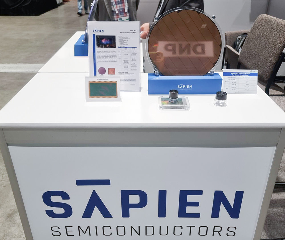 지난해 5월 열린 미국 SID 디스플레이 전시회 당시 사진, 전시 제품은 레도스 상보형 금속산화반도체(CMOS) 백플레인 12인치 실리콘 / 출처=사피엔반도체사피엔반도체는 마이크로 LED 디스플레이 구동용 집적회로 전문 기업으로, 독자적인 LEDoS(LED 실리콘) 기술과 저전력 메모리 내 픽셀 기술을 통해 마이크로 LED 디스플레이 시장에서 두각을 드러내는 기업이다. 특히 AI 글래스의 핵심 기술인 AI 글래스용 디스플레이 구동 칩 기술을 보유하고 있다.