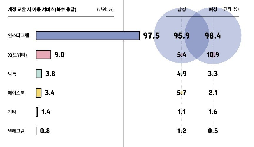 SNS 계정으로는 97.5%가 인스타그램을 선택했고, 카카오톡 계정을 공유하는 비율은 15.8%에 불과했다. 첫 만남에서는 카카오톡보다 인스타그램 같은 SNS가 더 선호되는 것으로 나타났다.