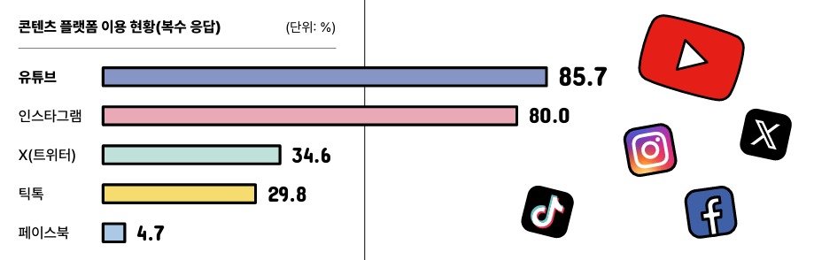 청소년들이 콘텐츠를 보기 위해 가장 많이 쓰는 앱은 유튜브가 85.7%, 인스타그램이 80.0%로 압도적이었다. 다음으로 X(트위터)가 34.5%, 틱톡이 29.9%, 페이스북이 4.7% 순이었다.