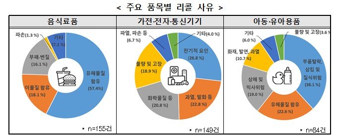 577건 가운데 품목별로는 음식료품이 155건(26.9%)으로 가장 많고 가전·전자·통신기기(149건, 25.8%), 아동·유아용품(84건, 14.6%)이 뒤를 이었다. 리콜 사유로는 음식료품의 경우 유해 물질 및 알레르기 유발 성분 함유가 89건(57.4%)으로 가장 많았고 이물질 함유(28건, 18.1%), 부패·변질(25건, 16.1%) 순이었다. 가전·전자·통신기기는 전기적 요인(40건·26.8%)이 많았고, 아동·유아용품은 부품 탈락, 삼킴, 질식 위험에 따른 리콜(32건·38.1%)이 다수였다.