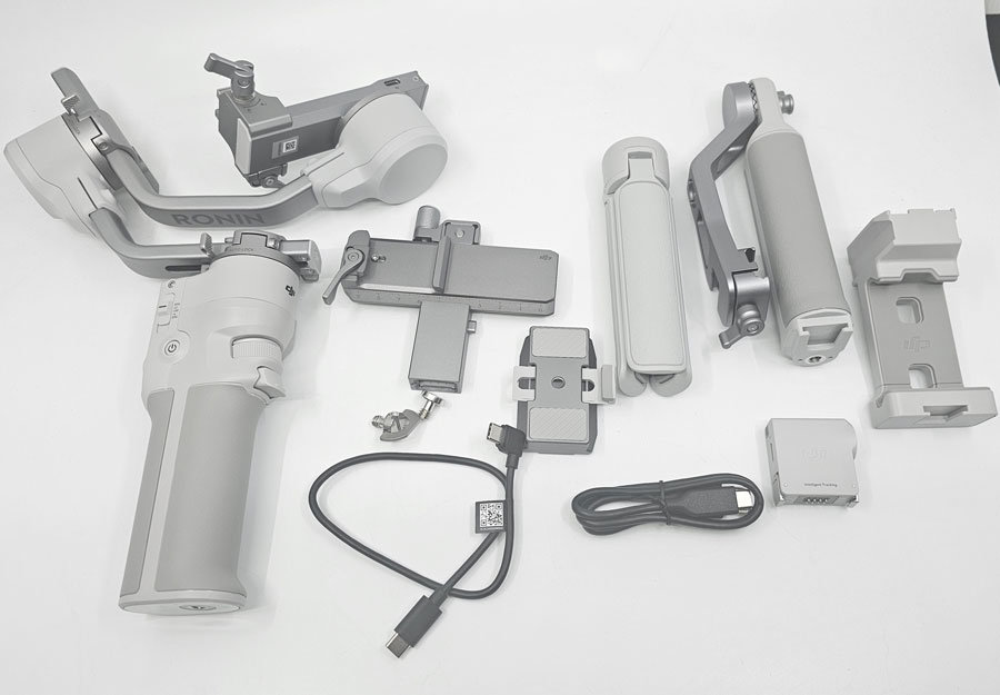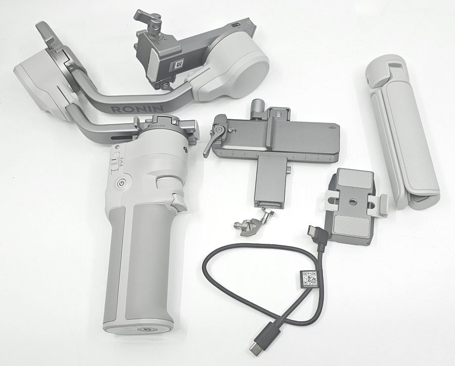 DJI RS 4 미니 제품 기본 패키지는 짐벌 본체와 더불어, 짐벌을 세우기 위한 미니 삼각대, 카메라를 짐벌에 손쉽게 탈부착할 수 있는 퀵 릴리즈 플래이트, 그리고 각종 케이블 및 고정 나사 등으로 이루어졌다.