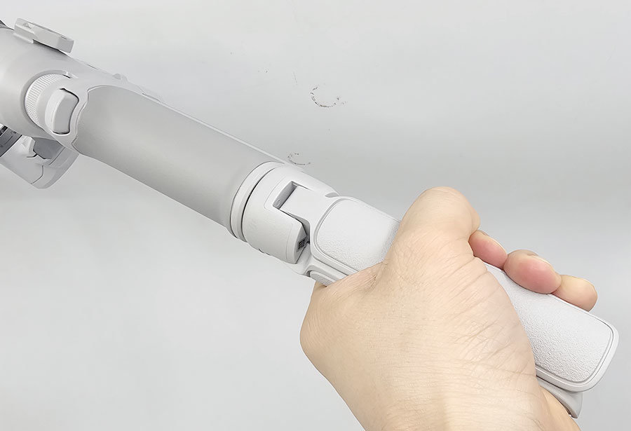 짐벌 본체 하단에는 미니 삼각대를 달 수 있다. 펴서 바닥에 세우는 용도 외에 접힌 상태로 연장형 손잡이처럼 쓰는 것도 가능하다. 손잡이 부분에는 다양한 사용자 인터페이스도 달려 있다.