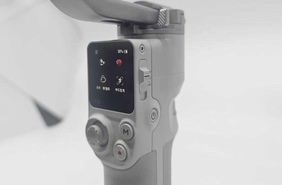 2개의 측면 스위치 및 버튼, 전면 스틱, 터치스크린 등으로 구성된 중앙 제어부 / 출처=IT동아좌측 전환 스위치는 전면에 달린 조이스틱의 기능을 설정한다. 전면 조이스틱은 기본적으로 짐벌에 탑재된 카메라의 방향을 임의의 상하좌우 방향으로 조금씩 이동시키는 기능을 수행한다. 다만, 전동 줌 기능을 탑재한 일부 소니 카메라를 이용하는 경우, 스위치 전환을 통해 조이스틱으로 줌 기능을 제어하도록 설정할 수도 있다.