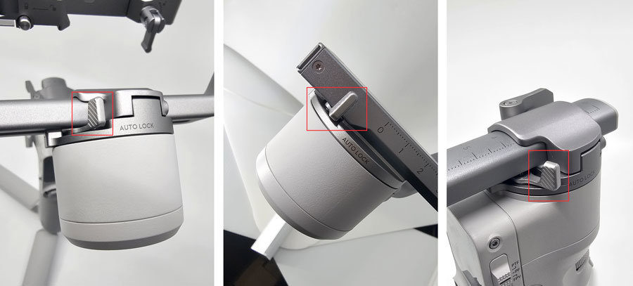 잠금 장치를 통해 사용자가 원하는 형태로 짐벌을 고정해 촬영하거나 보관/휴대할 수 있다. 그리고 다음 촬영을 위해 이동을 시작하면 1초 이내에 자동으로 각 관절 부위의 잠금이 자동으로 해제되며 바로 안정적인 촬영을 할 수 있는 상태가 된다. 상당히 편리하다.