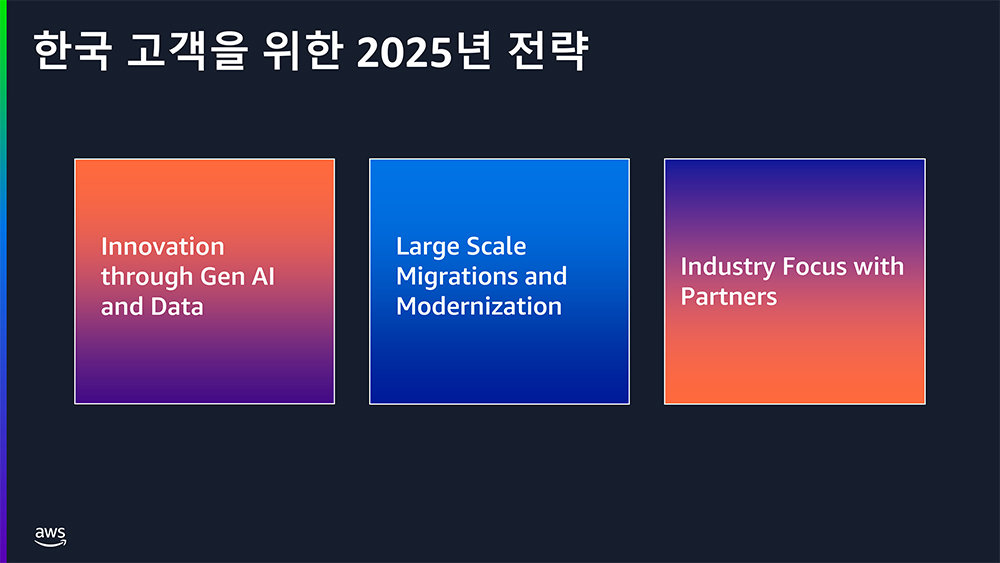 AWS코리아는 생성형 AI 및 데이터 혁신, 대규모 클라우드 이전 및 현대화, 산업 현장 파트너의 집중 세 가지를 주요 전략으로 소개했다 / 출처=AWS코리아