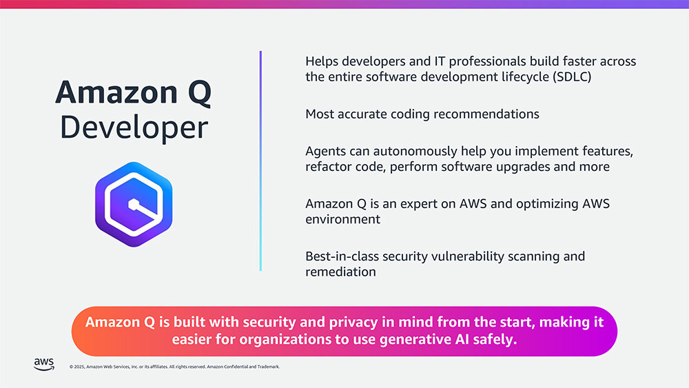 최상위 레이어는 직접적으로 생산성 향상에 기여하는 서비스로, 아마존 Q 비즈니스와 아마존 Q 디벨로퍼가 여기에 해당한다. 김기완 총괄은 “아마존 Q 비즈니스를 활용하면 세일즈포스, 아사나, 구글 등에서 확보한 비즈니스 데이터를 AI로 가공할 수 있고, AI 권한에 따라 사용할 수 있는 데이터만 선별해 개발에 쓸 수 있다. Q 디벨로퍼는 개발자용 서비스로 코드 추천뿐만 아니라 고객이 쓰고 있는 개발 파이프라인에 맞춰 자동화하거나, 위험성을 자동 판단 및 스케줄링할 수도 있다. 또한 AWS를 잘 아는 AI여서 AWS 기반 서비스를 잘 만들 수 있다”라고 말했다.