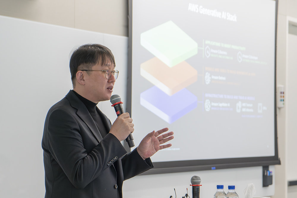 김기완 AWS 솔루션스 아키텍트 총괄이 AWS의 생성형 AI 전략 및 접근법을 소개 중이다 / 출처=IT동아