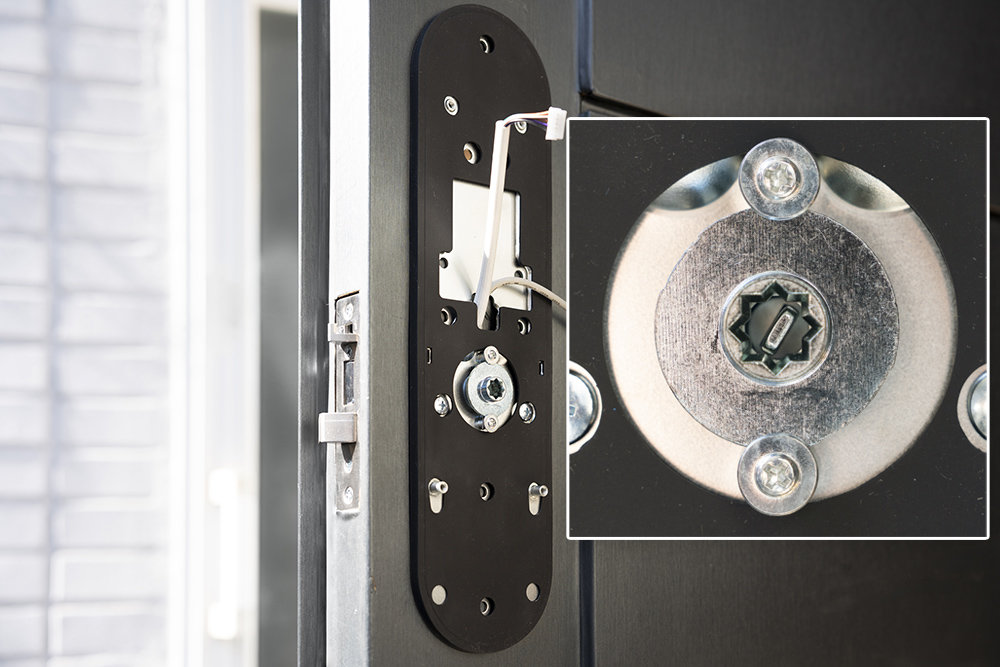 그 다음 실내용 몸체의 고정판을 문에 건다. 이때 두 개의 케이블이 고정판 중앙의 구멍으로 나와야하며, 고정 시 눌리지 않게 조정한다. 그다음 고정판과 실외용 몸체의 수평을 맞춰 단단히 고정한 뒤, 핸들 샤프트를 실외용 몸체 중심에 넣는다. 중심부를 보면 핸들 샤프트가 맞게 작은 구멍이 있는데, 샤프트가 구멍 안쪽으로 완전히 들어가도록 살짝 돌려가며 넣는다.