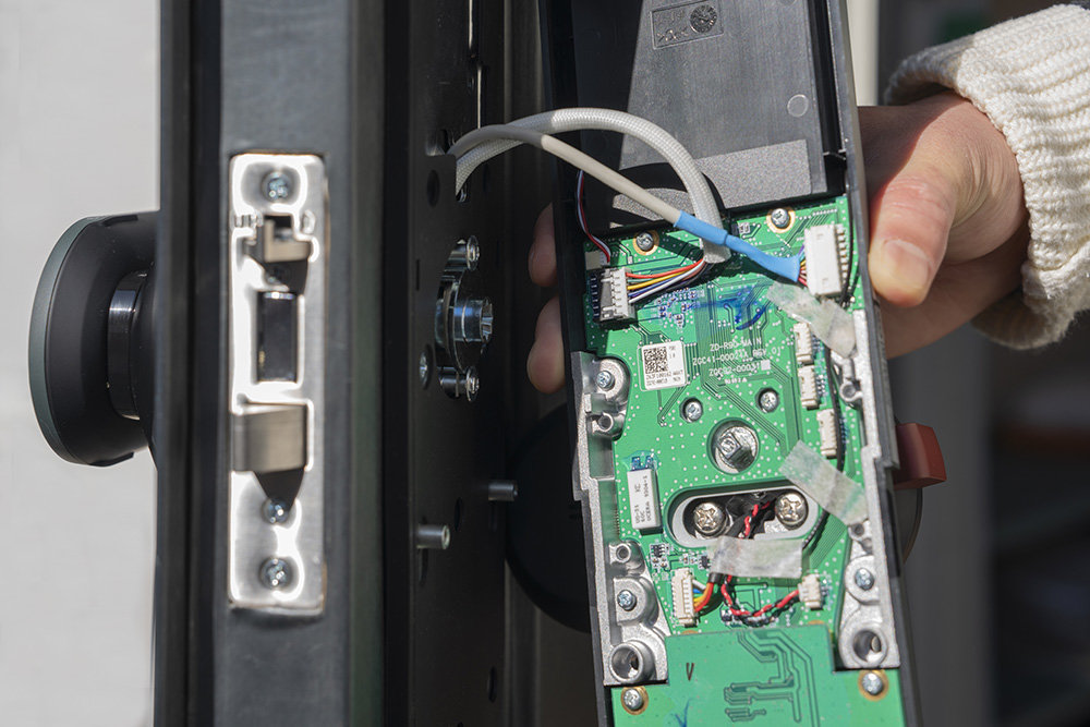 핸들 샤프트를 삽입하고, 케이블을 잘 정리한 다음 문에 잘 고정한다 / 출처=IT동아그 다음 실내용 몸체의 고정판을 문에 건다. 이때 두 개의 케이블이 고정판 중앙의 구멍으로 나와야하며, 고정 시 눌리지 않게 조정한다. 그다음 고정판과 실외용 몸체의 수평을 맞춰 단단히 고정한 뒤, 핸들 샤프트를 실외용 몸체 중심에 넣는다. 중심부를 보면 핸들 샤프트가 맞게 작은 구멍이 있는데, 샤프트가 구멍 안쪽으로 완전히 들어가도록 살짝 돌려가며 넣는다.