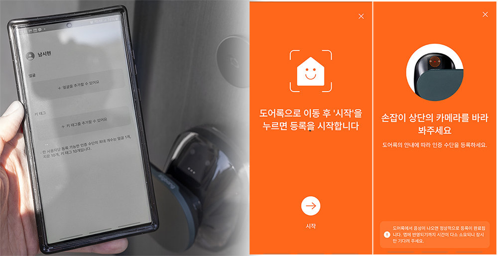 기기 등록이 완료되면 계정에 얼굴 혹은 키 태그 등록 항목이 있다. 안면 등록 과정은 얼굴을 추가할 수 있어요를 눌러 시작한다. 그러면 자동으로 화면이 ‘도어록으로 이동 후 시작을 누르면 등록을 시작합니다’로 바뀌고, 도어록 앞에 가서 선다. 등록이 시작되면 핸들 상단의 카메라가 빨간색으로 깜빡이고, 등록이 끝나면 내부 손잡이에 있는 스피커에서 등록 완료 안내가 뜬다.