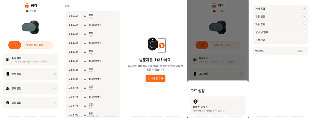 관리자는 출입 관리, 임시 출입, 원격 제어, 음량 및 인식 거리 설정 등 세부 기능을 쓸 수 있다 / 출처=IT동아얼굴 인식을 비롯한 모든 등록 절차가 마무리되면 이제 사용하는 일만 남았다. 도어록은 평소에 잠금 및 열림 상태를 알람으로 받을 수 있다. 들어갈때는 안면 인식이므로 누가 언제 들어갔는지 알 수 있고, 나올때는 실내에서 열렸다는 알람만 뜬다. 또한 문이 닫히지 않으면 자동으로 잠기지 않았다고 스마트폰으로 알림을 보낸다.
