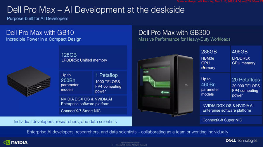 최상위 모델인 ‘GB300 기반 델 프로 맥스(Dell Pro Max with GB300)’는 서버 수준의 컴퓨팅을 데스크톱에서 구현할 수 있는 고성능 제품이다. 새로 출시된 엔비디아 블랙웰 울트라 GB300 칩을 탑재했으며 최대 20페타플롭의 AI 컴퓨팅 성능을 발휘한다. 또한 최대 288GB의 HBM3e GPU 메모리 및 496GB의 LPDDR5X CPU 메모리를 더한 784GB의 메모리, 그리고 초고속 네트워킹 솔루션인 엔비디아 커넥트X-8 슈퍼NIC(NVIDIA ConnectX-8 SuperNIC)까지 탑재했다.
