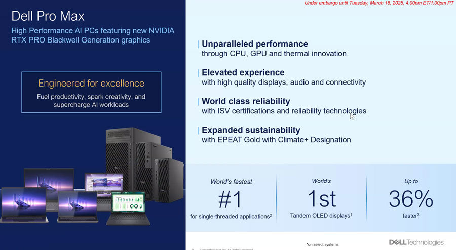 그 외에도 델은 다양한 델 프로 맥스 노트북 및 데스크탑을 선보일 예정이다. 이들 제품에는 엔비디아 RTX 프로 블랙웰 GPU를 비롯, 인텔 코어 울트라 시리즈 2(Intel Core Ultra Series 2), AMD 라이젠(AMD Ryzen) 및 AMD 스레드리퍼(AMD Threadripper) 프로세서 등의 고성능 하드웨어를 선택해 AI 기반 비즈니스의 효율성을 높일 수 있다.