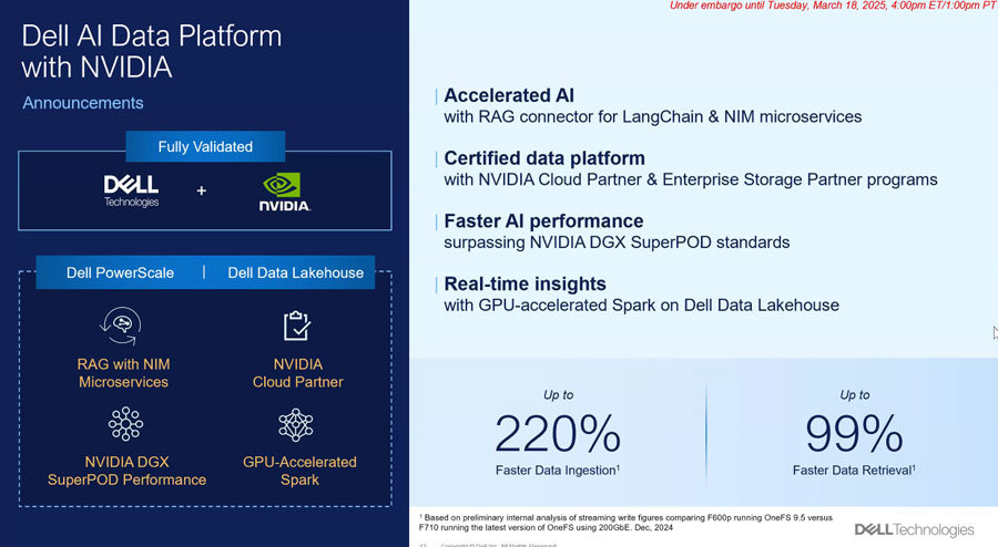 특히 여기에 적용되는 델 파워스케일(Dell PowerScale) 스토리지는 기존 시스템 대비 데이터 수집 속도는 220%, 데이터 검색 속도는 99% 더 향상되었다. 이는 슈퍼컴퓨터 시스템인 엔비디아 DGX 슈퍼POD(NVIDIA DGX SuperPOD)의 요구사항을 충족한다. 엔비디아 클라우드 파트너 프로그램 및 엔비디아 인증 스토리지 프로그램도 통과했다고 델은 강조했다.