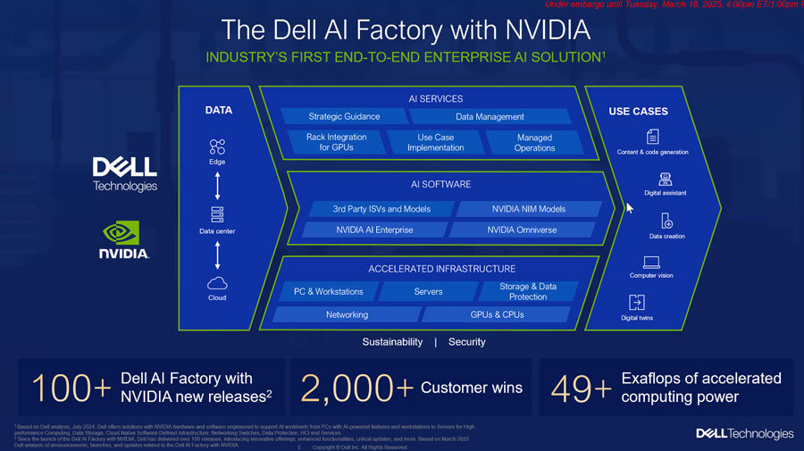 또한, AI PC부터 워크스테이션, 컴퓨팅 서버, 데이터 스토리지, 네트워크 스위치, 클라우드 소프트웨어에 이르기까지 다양한 형태로 선보인다. 이와 관련해 델은 3월 18일, 온라인 브리핑을 통해 엔비디아 기반 델 AI 팩토리에 해당하는 다양한 포토폴리오를 소개했다.
