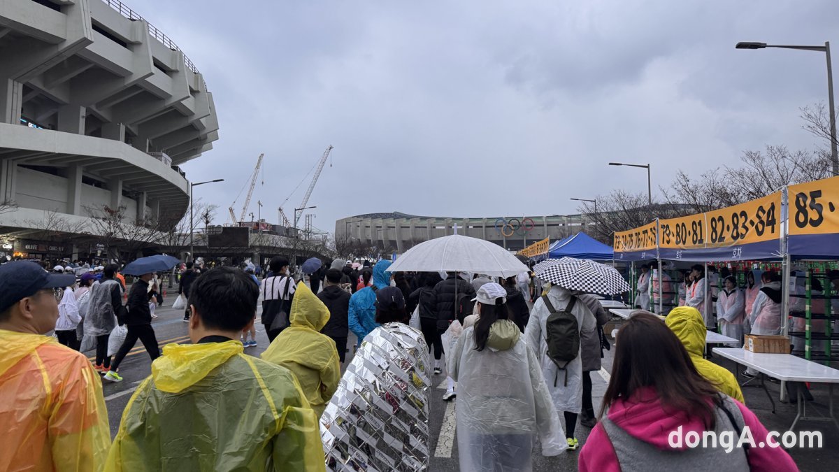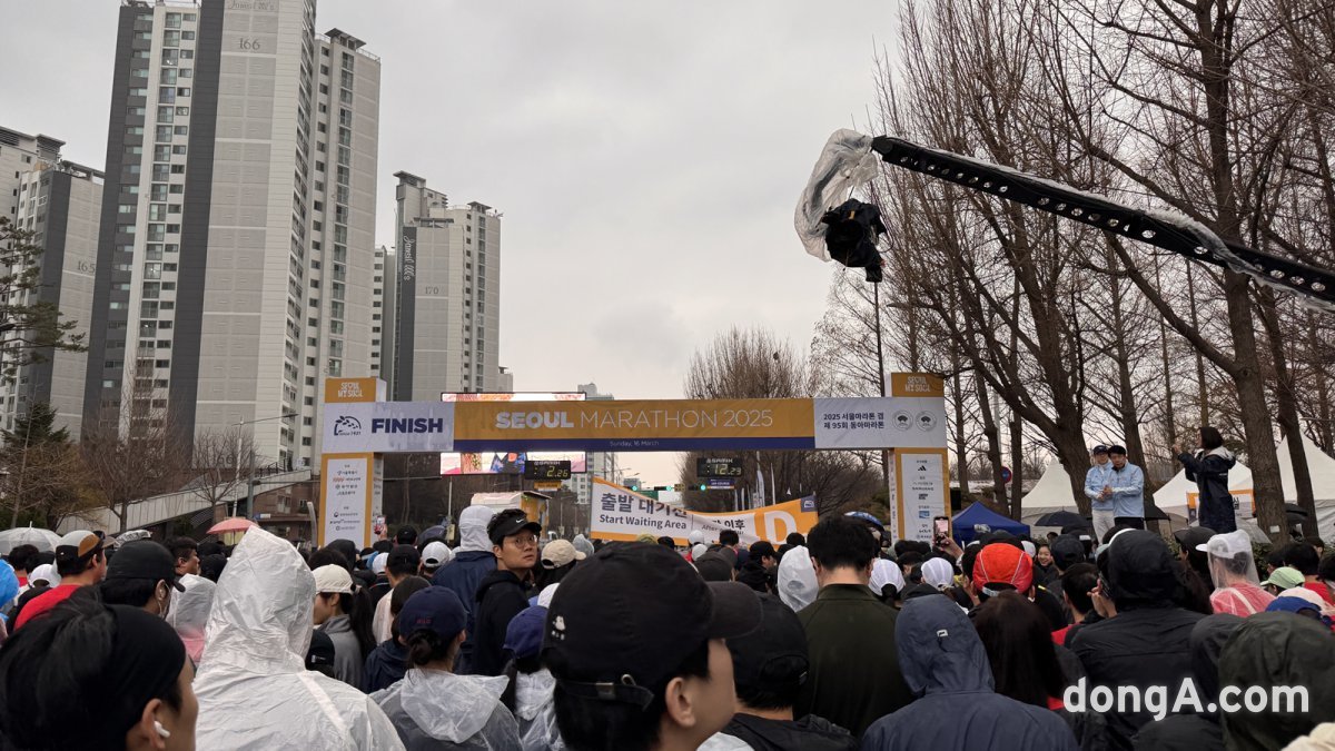 대회를 앞둔 러너들은 이른 아침부터 비가 내린 날씨에 체온을 유지하기 위해 우비를 입거나 비닐담요를 두르고 있었다. 윤우열 기자 cloudancer@donga.com지난 16일 오전 8시경 서울 잠실종합운동장에는 2만 명에 달하는 러너가 모여들었다. 한국 유일의 ‘플래티넘 라벨’ 대회인 2025 서울마라톤 겸 제95회 동아마라톤에 참가하기 위해서다. 봄비가 부슬부슬 내리면서 기온이 섭씨 6도까지 내려갔지만, 현장은 러너들의 열기로 가득했다.