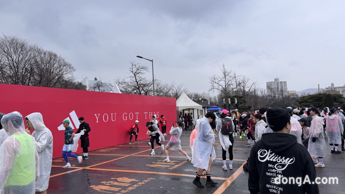 대회 시작을 앞둔 러너들이 큰 원을 그린 채 서서 몸을 풀고 있다. 윤우열 기자 cloudancer@donga.com역 밖으로 나서자 본격적인 러너들의 축제 현장이 펼쳐졌다. 이들은 대부분 체온을 유지하기 위해 우비를 입거나 비닐담요를 두르고 있었다. 또한 대회 시작을 앞두고 큰 원을 그린 채 서서 몸을 풀기도 했다.