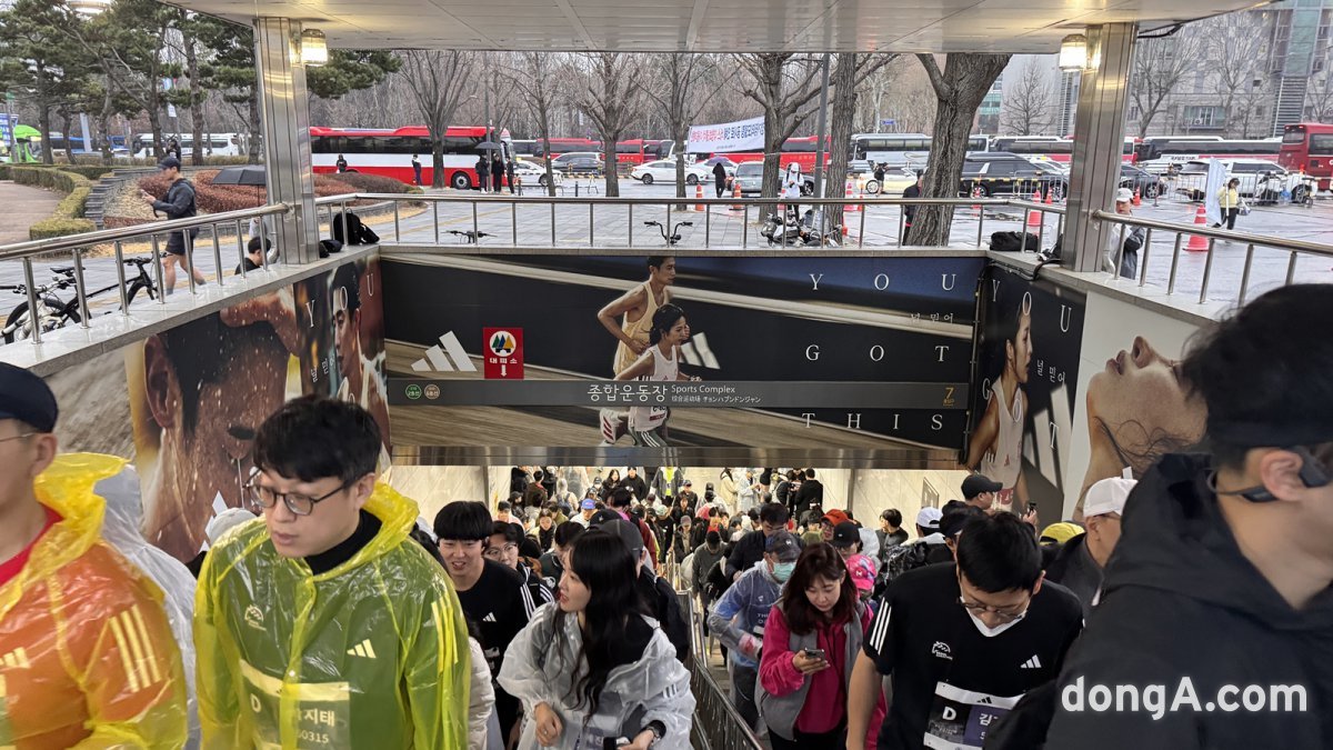 지난 16일 오전 7시경 서울마라톤 10km 코스 시작점인 지하철 2‧9호선 종합운동장역 안에는 비를 피해 러닝 복장으로 채비에 나선 러너들로 가득했다. 윤우열 기자 cloudancer@donga.com이날은 이른 오전부터 비가 내렸다. 오전 6시경 대회 출발지로 이동하는 지하철에 탑승하자 러너들이 하나둘씩 보이기 시작했다. 10km 코스 시작점인 2‧9호선 종합운동장역에는 도착하니 주변은 온통 러너들이었다. 이들은 비를 피해 지하철 역 안에서 러닝 복장으로 채비에 나섰다.