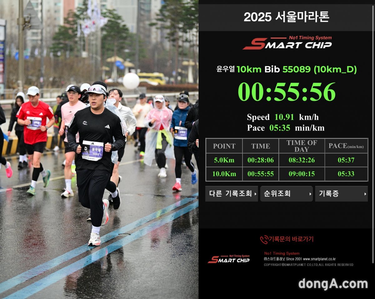 10km 코스 도착점에 이르자 ‘삐빅’ 소리가 울렸다. 성적표가 기록되는 소리다. 결과는 55분56초. 1km당 5분35초 페이스로 레이스를 마쳤다. 윤우열 기자 cloudancer@donga.com출발점이었던 도착점에 이르자 대회 조직위 관계자들까지 도열해 응원 열기를 더했다. 이들과 하이파이브를 끝으로 ‘삐빅’ 소리가 울렸다. 10km 성적표가 기록되는 소리다. 결과는 55분56초. 1km당 5분35초 페이스로 레이스를 마쳤다.