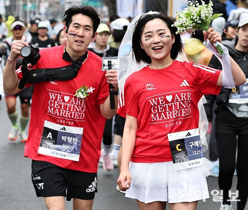 예비부부 박형민, 구혜인 씨는 ‘우리 결혼해요’가 적힌 티셔츠를 입고 10km 코스를 완주한 뒤 부케를 들고 포즈를 취했다. 양회성 기자 yohan@donga.com고려사이버대학교 교직원과 학생들은 새 학기를 맞아 소통과 화합의 의미로 10km 코스에 함께 도전했다. 최연현 씨(소방안전학부 22학번)는 “사이버대학의 특성상 학우들과 직접 만날 기회가 많지 않은데, 마라톤을 통해 함께 호흡하며 교류할 수 있어 의미 있었다”며 “앞으로도 이런 행사에 적극 참여해 도전과 성장을 계속 이어가고 싶다”고 말했다.