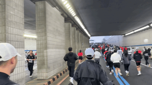 송파지하차도는 반환점을 향하는 러너들과 반환점을 돌고 온 러너들이 마주치는 공간이었다. 숨이 턱턱 차는 순간에도 서로를 향해 외치는 ‘파이팅’이라는 응원 메시지가 지하차도에 갇혀 울렸다. 윤우열 기자 cloudancer@donga.com송파지하차도는 반환점을 향하는 러너들과 반환점을 돌고 온 러너들이 마주치는 공간이었다. 숨이 턱턱 차는 순간에도 서로를 향해 외치는 ‘파이팅’이라는 응원 메시지가 지하차도에 갇혀 울렸다.