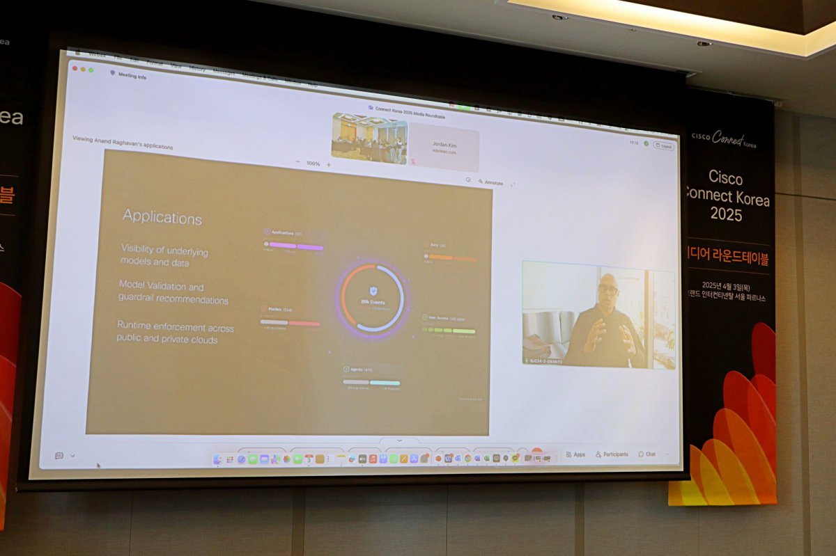 이날 행사와 함께 진행된 미디어 라운드테이블에서 시스코는 AI 보안 솔루션 및 AI 에이전트를 소개했다. 최지희 시스코코리아 대표는 “지난 40년간 네트워킹 분야를 이끌어온 시스코는 향후 보안, AI, 데이터 기업으로 거듭날 것”이며, “AI 적용 사례가 본격적으로 등장하면서 네트워크, 스토리지, 컴퓨팅의 통합과 AI 보안이 큰 화두가 될 것”이라고 말했다. 시스코는 지난해 AI 보안 기업 5곳을 인수한 바 있으며, 특히 이번 행사는 보안·데이터 분석 기업 스플렁크(Splunk)와의 통합 이후의 첫 공식 행사다.